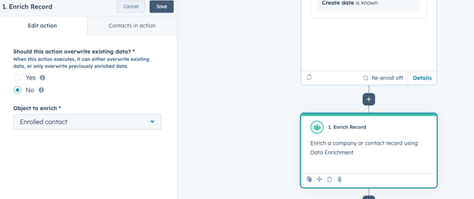 Add an enrichment action. Configure it to fill missing fields only by default so you don’t overwrite trusted values — overwrite is optional depending on your confidence, for this I set to no, just fill missing values on the Enrolled contact.