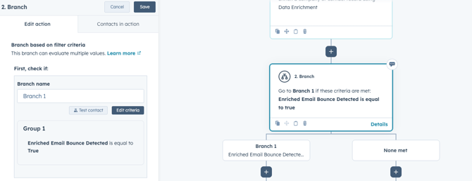 Add an If/then branch that checks the enrichment result for a bounce indicator (the free hidden HubSpot property that flags a potential bounced email via its database and partners). If a bounce risk is detected, route contacts down the “Potential bounce” path.