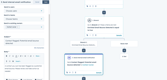In the “Potential bounce” branch, notify the contact owner via email and/or HubSpot notification (or Slack/MS Teams if you prefer). Include key properties in the notification: contact name, email, recent conversion or form, and a short note on the recommendation (for example: “A contact you own has been flagged as a potential email bounce”).