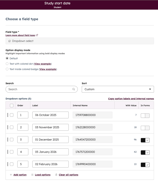 Create a dropdown property (Course Start Date (Friendly)) with labels like “8th September 2026” and internal values as Unix timestamps - HubSpot will require a 13-digit timestamp for this method to work: