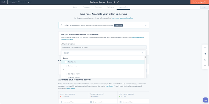 - Use HubSpot’s Slack integration to alert your team in real time when new CES feedback arrives or even MS Teams.