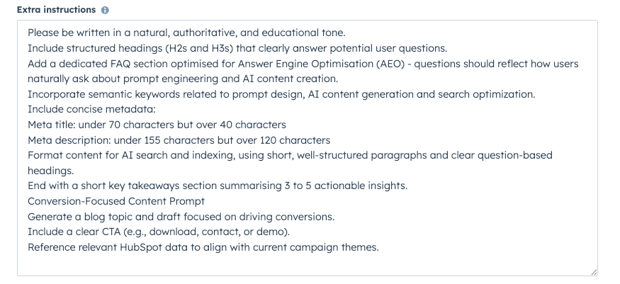 - Provide instructions and context (“prompt engineering”), e.g., target audience, country code, SEO focus (AEO/SEO), brand guidelines, PDFs, and other references.