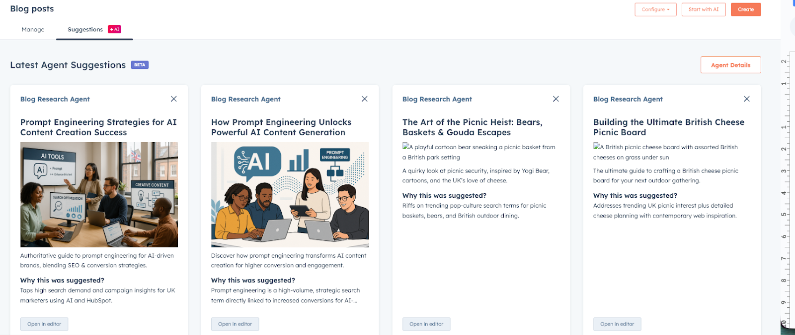 - Navigate to HubSpot Content > Blog > AI Suggestions