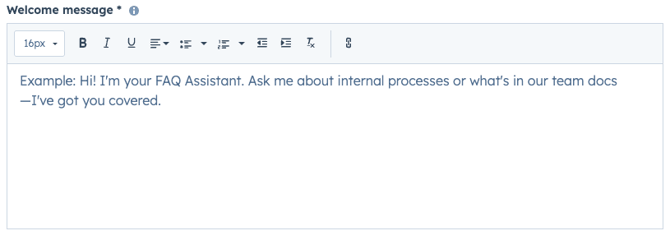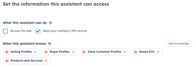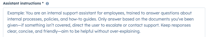 You may want to upload your company's Standard operating procedures, Brand voice guide, Technical FAQs (if you don’t have them in the HubSpot Knowledge Base), and a few case studies that the assistant can use as templates.