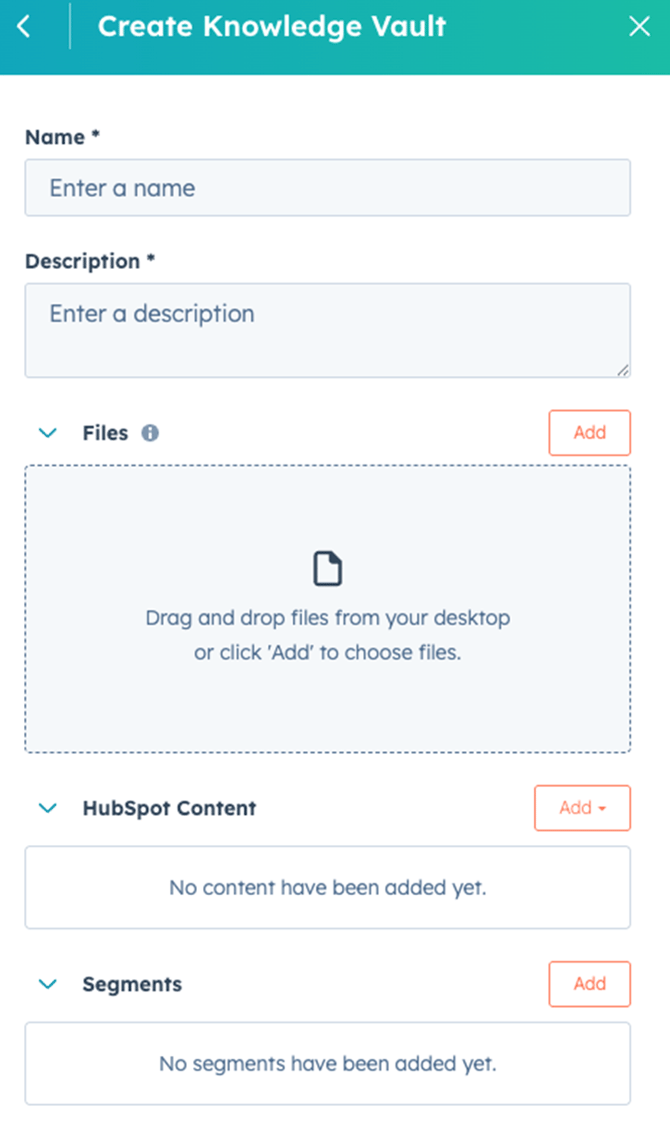You can drag and drop the files that you want to use with this assistant. However, the true power lies in selecting the HubSpot Content you can define and the Segments you can attach to this agent.