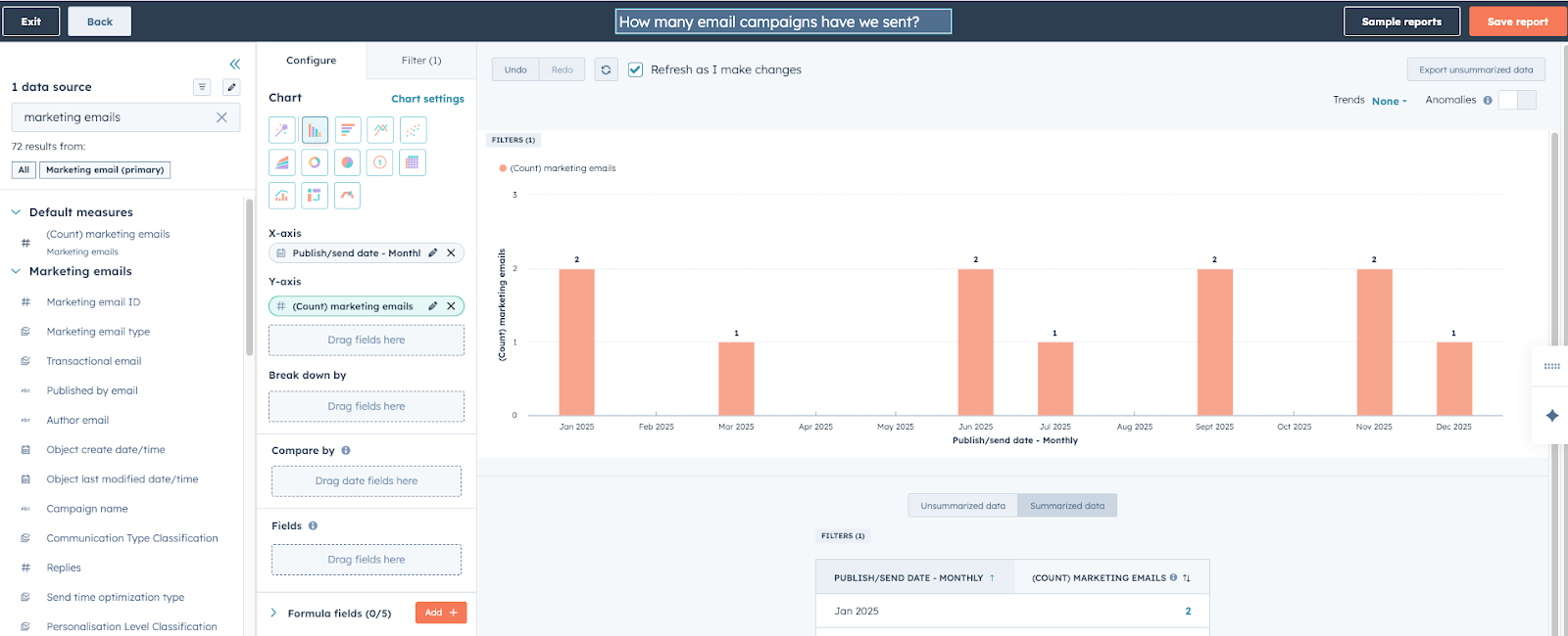 - On the Y-axis, select Count of Marketing Emails. This counts the number of distinct campaigns published.