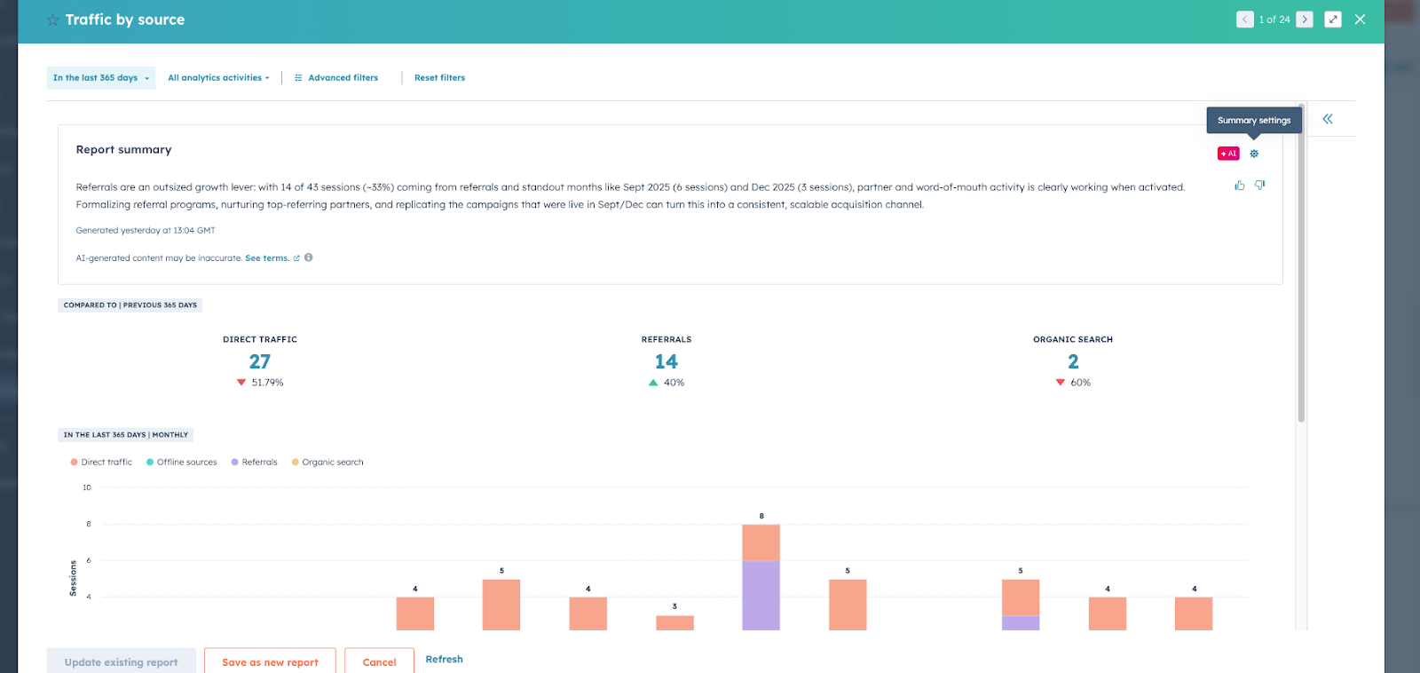 - Adjust filters (e.g. traffic sources) - the summary updates automatically.